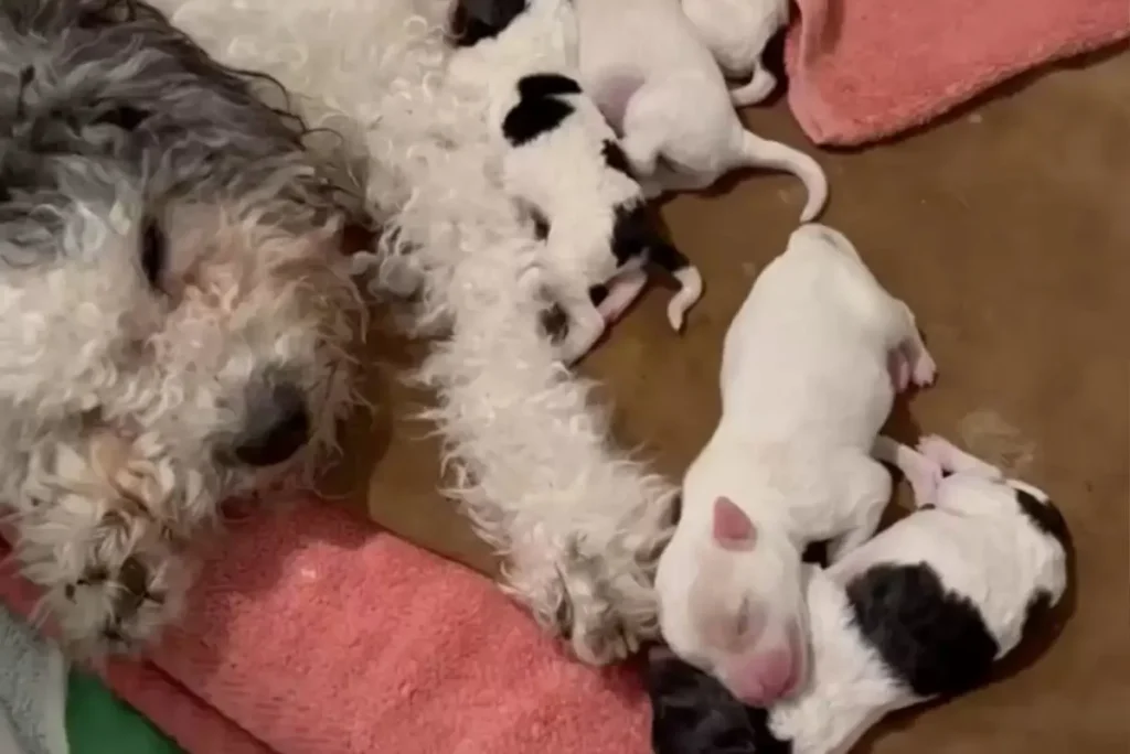 At first, I panicked, but then magically … mom mode kicked in,’ said Belle. I called the friend who helped me groom her, and she dashed over with towels, and got there just as the third and fourth came along, to help get them cleaned up and nursing on Mama.
